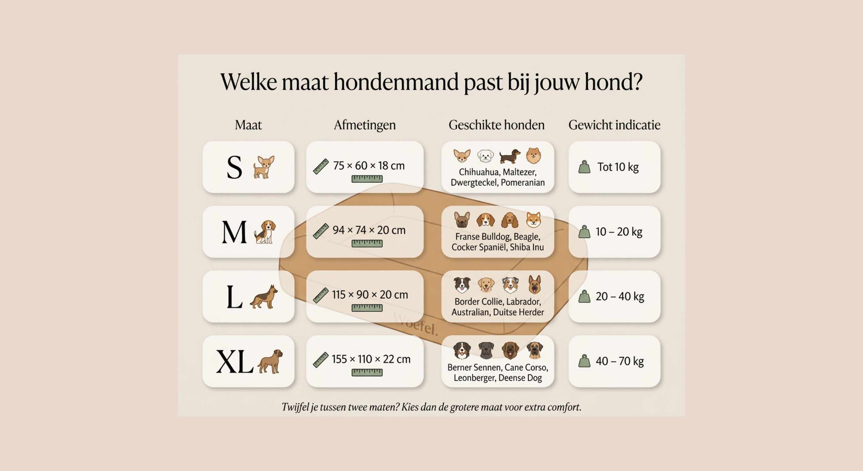 De juiste maat hondenmand draagt bij aan het comfort en de rust van je hond. Met onze maattabel helpen we je eenvoudig bepalen welke maat het beste past op basis van gewicht, lengte en ras.