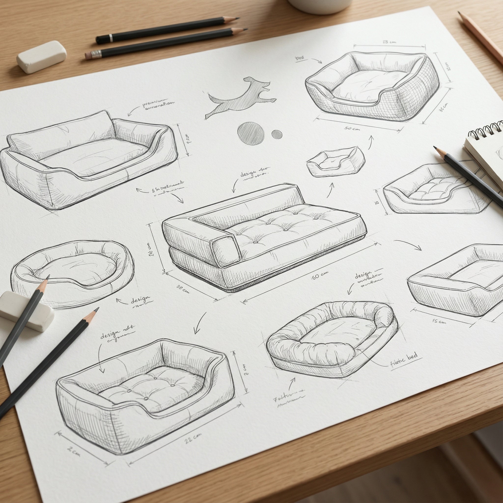 In deze fase begon Woefel op papier. Ideeën werden geschetst, vormen getest en comfort stond centraal. Elk ontwerp ontstond vanuit één vraag: waar ligt een hond écht graag in? Door te tekenen, te schrappen en opnieuw te beginnen, werd de basis gelegd voor manden die rust, geborgenheid en kwaliteit uitstralen.